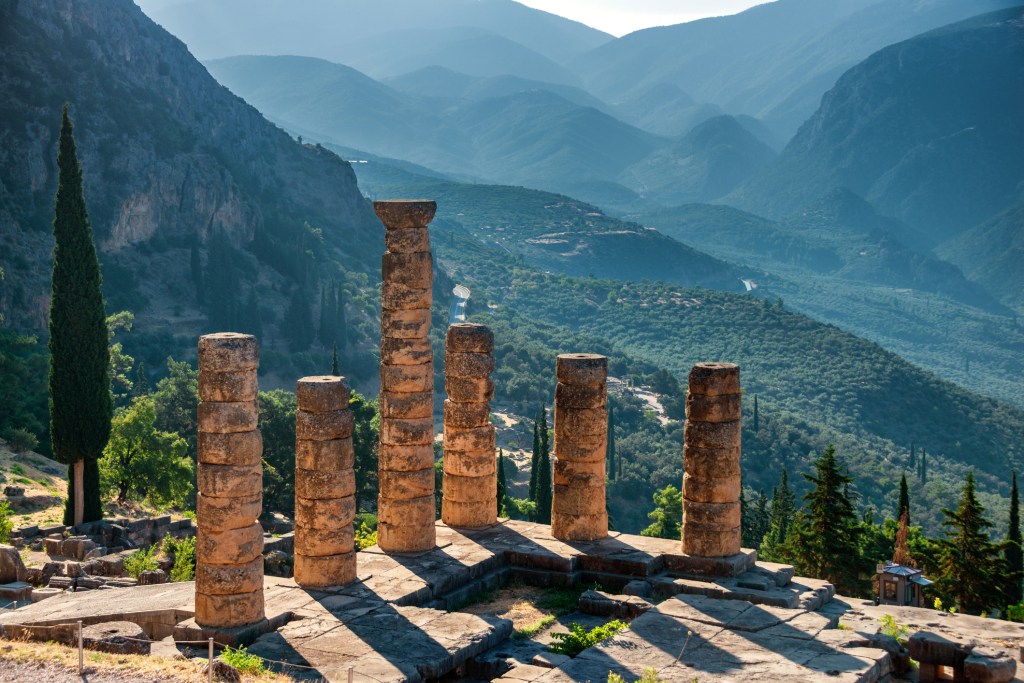 Archaeologists have discovered ritual artifacts dating back to 4000 BCE, plus evidence that a Mycenaean settlement was established there by 1400 BCE. This sacred space was worshipped by locals as the navel (omphalus) of mother earth (Gaia). Some saw it as the birthplace of humanity, and named it Delphus, meaning “womb”.
