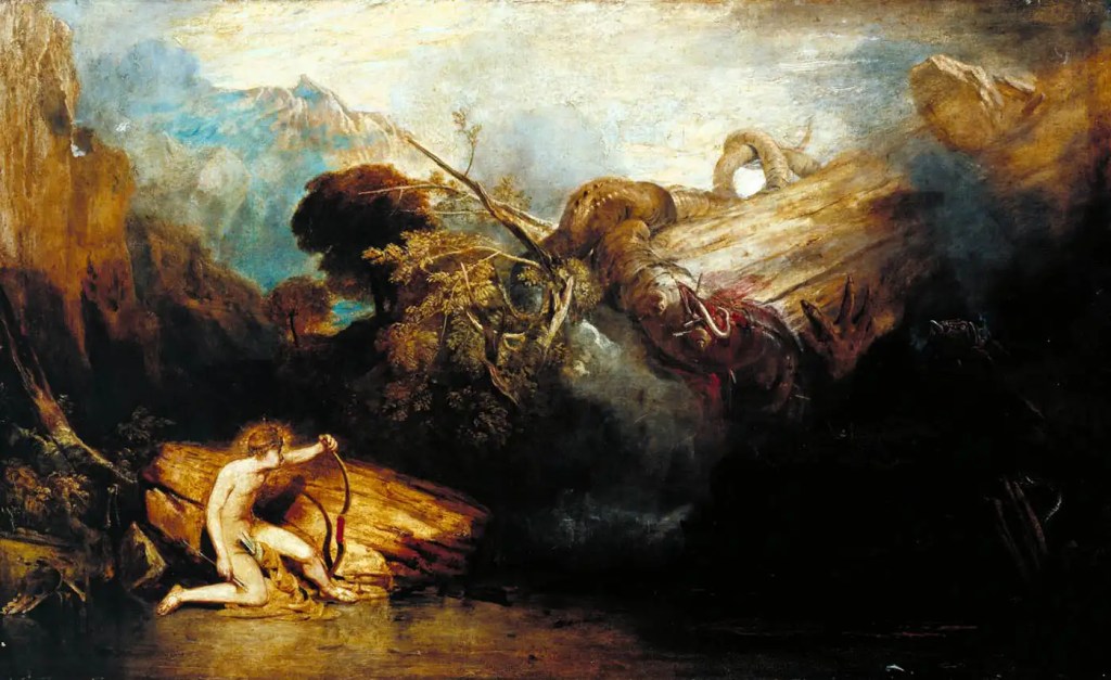 Worried that no one would tend to his oracle, he looked for a boat in the Bay of Corinth. When he spotted a ship he took on the shape of a dolphin and swam to the boat. As Apollo Delphinius “Apollo of the Dolphin,” he flipped himself onto a boat sailing from Knossos, Crete. When Apollo revealed his true identity he instructed the ship’s crew to travel to Delphus and serve as his caretakers and priests. They were tasked with protecting the laurel trees along with the spring and its cave. Upon arriving at Delphus, the sailors found the corpse of Gaia’s serpent, which they named Pytho (Python) based on the verb puthein, “to rot”.
