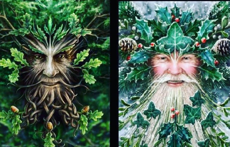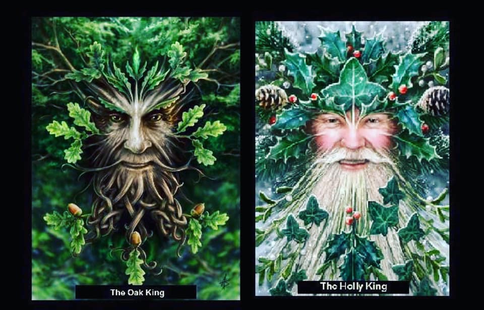 On the Summer Solstice the Oak King was cloaked in green leaves while the Holly King silently sprouted white blossoms. In Fall the Oak King dropped its leaves and acorns as the Holly King’s berries turned red. This yearly cycle between the evergreen holly and the deciduous oak was a metaphor for the changing of the seasons and the endurance of nature.
