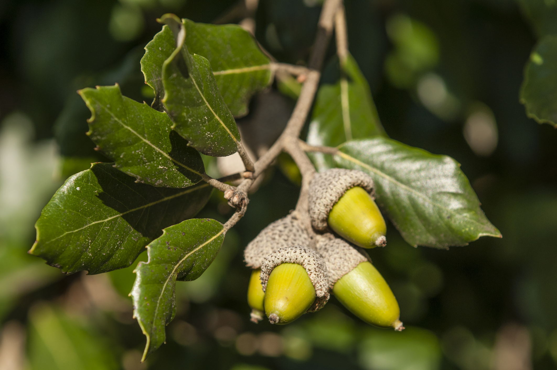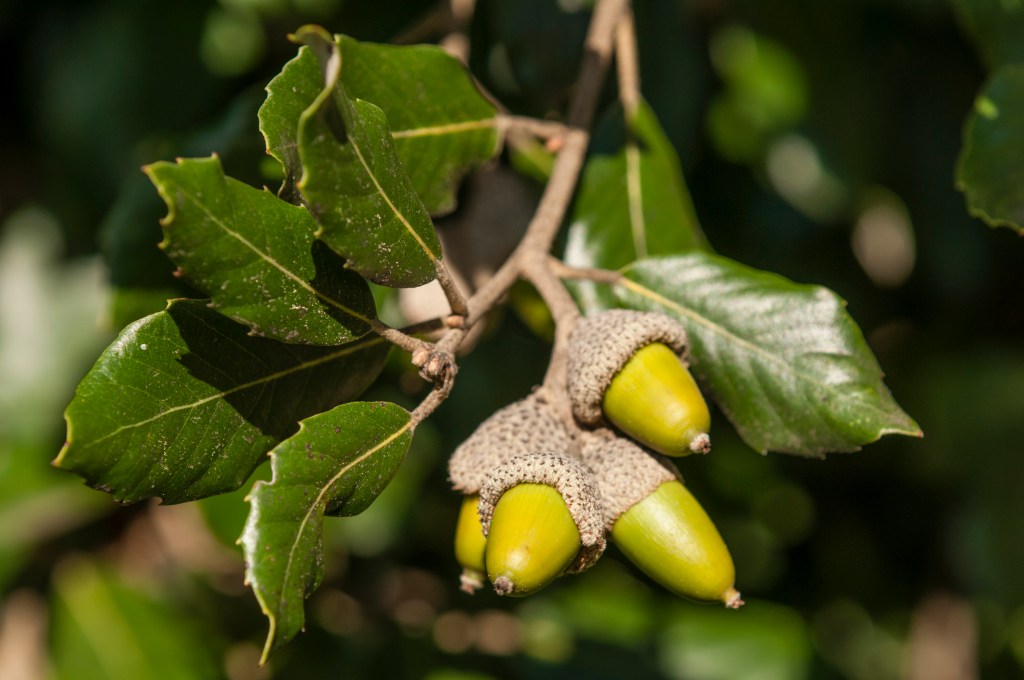 Holly is dioecious, meaning there are male and female trees, which both produce white blossoms, but only the female tree produces the iconic red berries. Oak trees are monoecious, meaning they are “one” as both “female and male”, with separate female and male flowers growing on each oak tree.