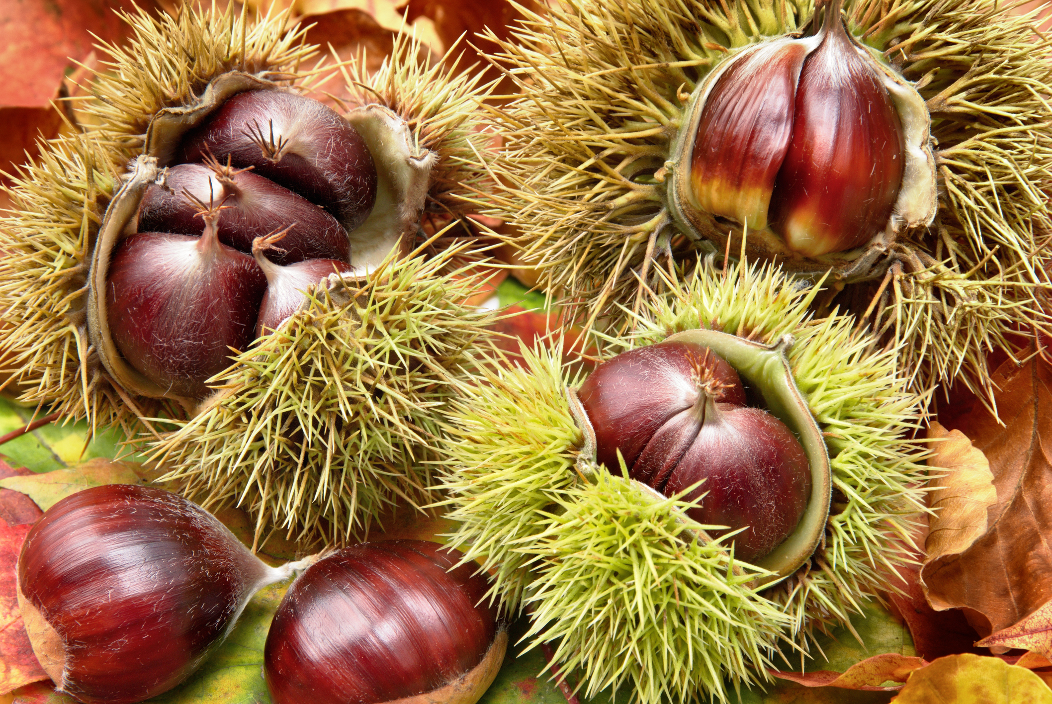 Sweet chestnuts are triangularly shaped, they have a flattened side with a pointed end and tuft or tassel, also referred to as a “flame.” Horse-chestnuts are irregularly shaped and rounder without a pointed end or tuft.