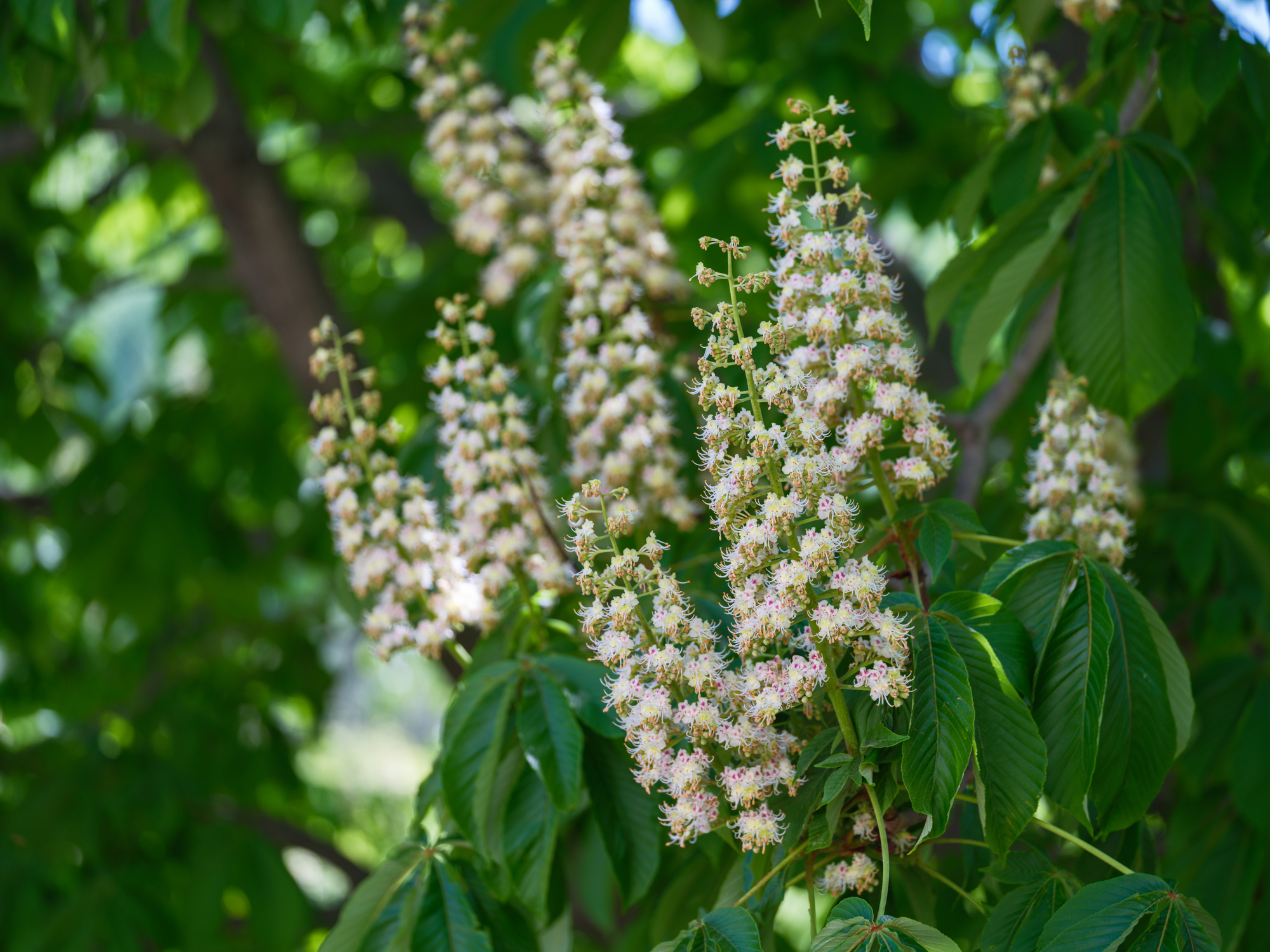 Chestnut trees display creamy-white colored flowers that drape down in clusters of long catkins. The flowers of a horse-chestnut are erect panicles that look like towers of white, yellow, pink and red blossoms based on the species.