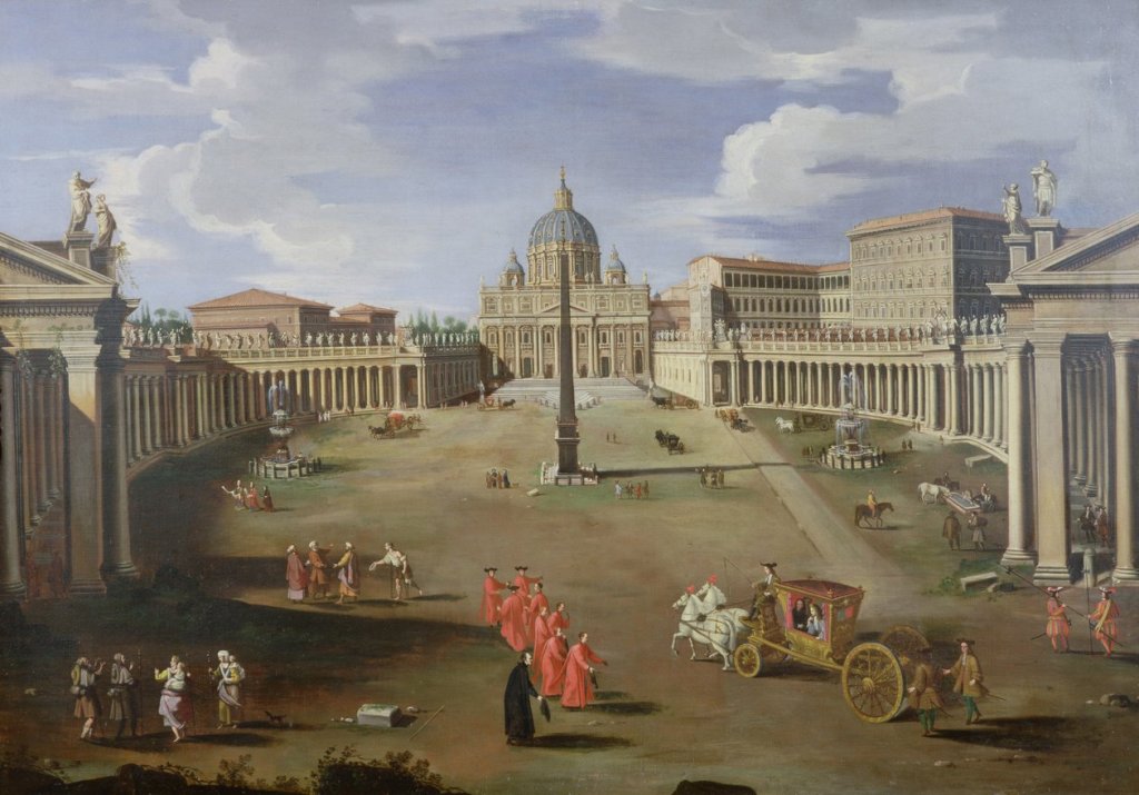St. Peter’s Square was designed by Gian Lorenzo Bernini, which featured the “Vatican Obelisk” in the center. The surrounding colonnades were created to welcome people into the embrace of the “Maternal Arms of Mother Church”. Construction began in 1656 and ended 1667.