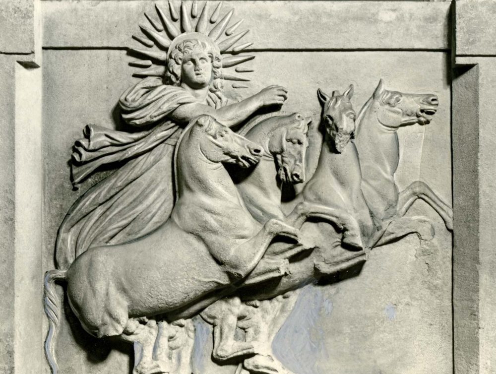 Helios, son of Hyperion, was the Greek Sun god who rode a chariot with four horses (quadriga) that pulled the sun from East to West each day. He wore a halo or “ring of light” around his head.