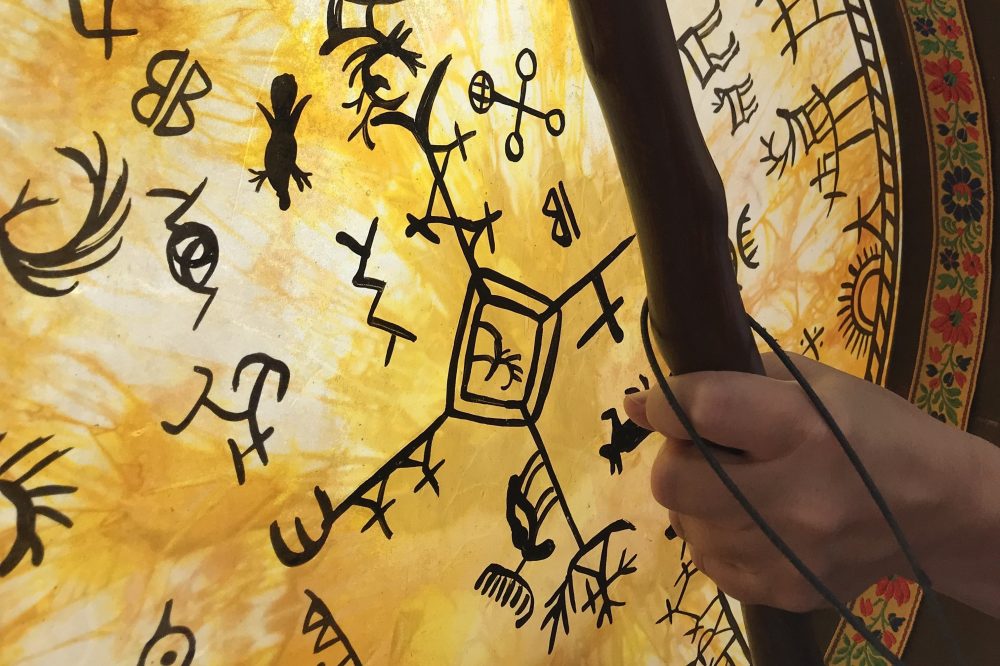 Drum frames were made of larch, while reindeer skins were stretched over the frame. The face of the drums were often painted with an image of Tuuru (cosmic tree) pointing to the North Star. The circle in the center represents the Sun radiating in all four directions. Images of reindeer indicate they were the “spirit animals” who guided and protected the shamans on their journey. Shaman’s would drum to enter a meditative state and travel through Tuuru to mediate with the spirit world.