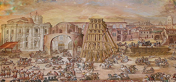 In 1586 the ancient Egyptian obelisk was moved 800 feet west of the Basilica under the direction of Italian Architect Domenico Fontana (b. 1543 – d. 1607). The goal was to have it be the centerpiece for the gathering place on the west side of St. Peter’s Basilica. This meant that people gathering around the obelisk faced East toward the rising Sun to honor the Son of God.