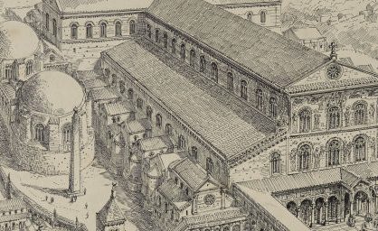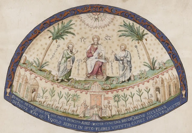 The Apse in the old St. Peters Basilica featured a fascinating mosaic of the apostles St. Peter and Paul standing next to Jesus on a throne. Two date palms appear next to them as symbols of victory.