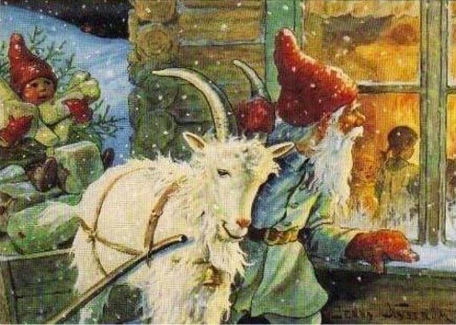Swedish painter Jenny Nystrom (1854 – 1946) illustrated postcards of the Jultomte (yule gnome) and his Julbock (yule goat) pulling a wagon full of gifts on Christmas Eve. The Jultomte is the Swedish version of Santa Claus, which takes us back to the magical of nature of the Winter Solstice.