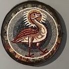 Beneath them are a row of twelve lambs with trees symbolizing the twelve Apostles. The two trees closest to the center are date palms with circular mosaics of a phoenix bird sitting in the branches. Only two small pieces of the entire original mosaic survived, one is the Phoenix wearing a halo.