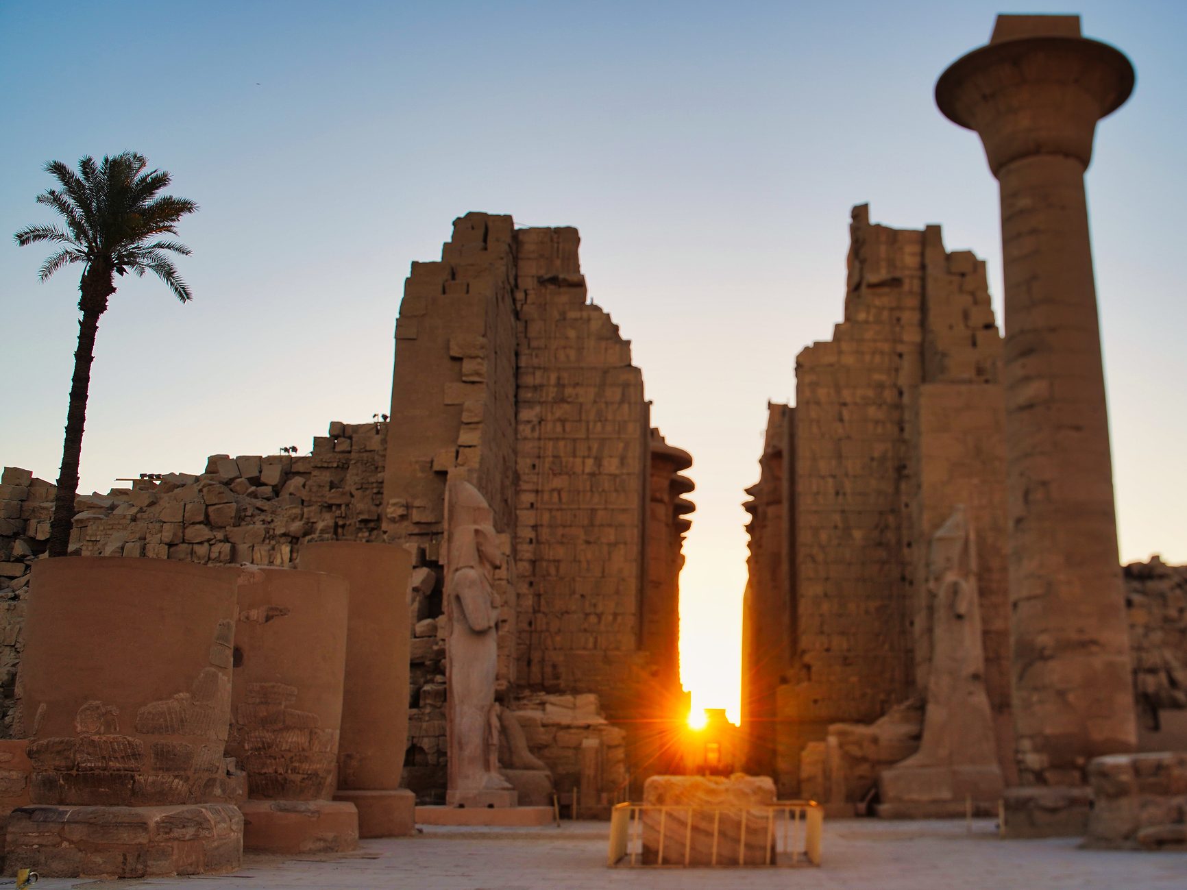 The Temple of Karnak was dedicated to Amun-Ra, (c. 1290 – 1224 BCE). It was constructed when Thebes was the capital of a unified Egypt. The temple is aligned with the sun so that on the Winter Solstice the sun shines on the shrine of Amun-Ra.