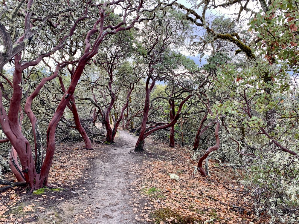 Since moving to Southwestern Oregon in 2017, I’ve been fascinated by two mystical and magical species of broadleaf evergreens, the Pacific madrone (Arbutus menziesii) and whiteleaf manzanita (Arctostaphylos viscida). We are surrounded by mature madrones and manzanitas in the mountains outside of Grants Pass, Oregon. Both of these species thrive in the Rogue River-Siskiyou National Forest within the Klamath-Siskiyou mountain range. Our climate provides cold/wet winters and hot/dry summers, similar to the climate of the Mediterranean basin.