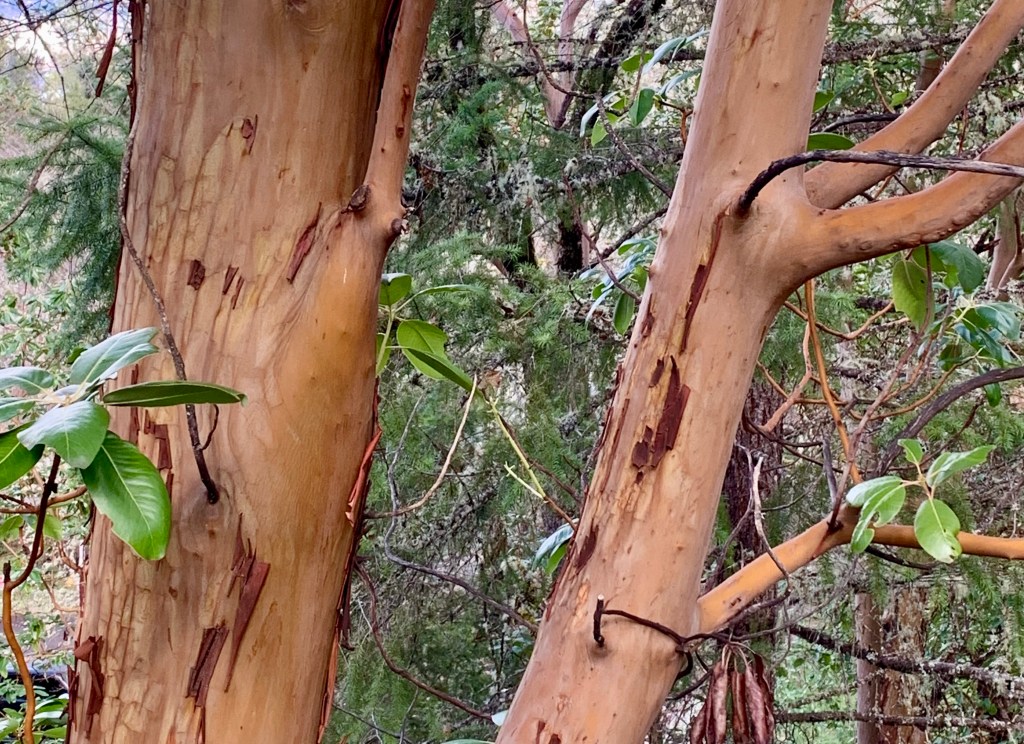 - Pacific Madrone – peeling bark reveals lighter, smooth reddish-orange bark.