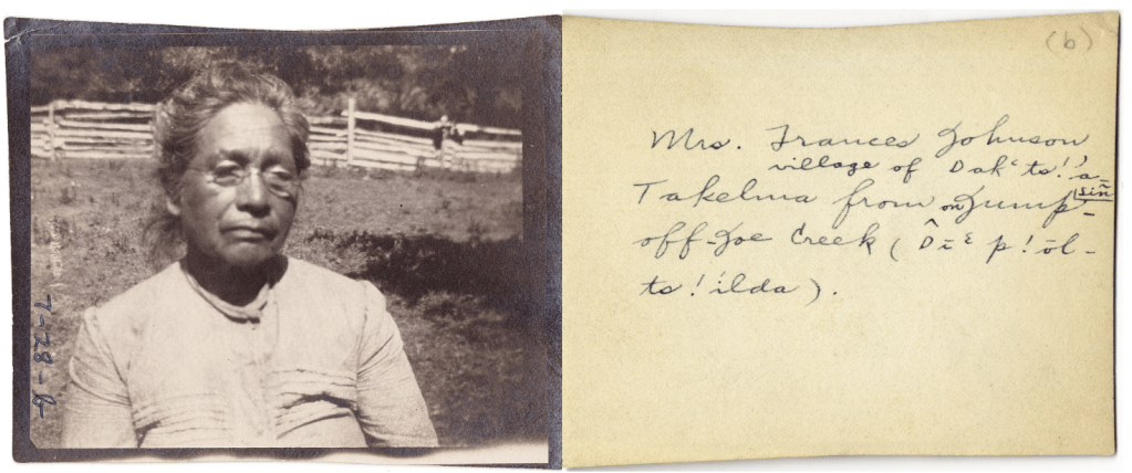 The First Nation people of this land were the Takelma (Dagelma), meaning “people along the Rogue River,” who settled here 15,000 years ago. Their people and their language were virtually extinguished due to the Rogue River Wars and the Gold Rush in the early 1850’s. Little was known about their history or language until Edward Sapir (1884-1939), a German-American linguist and anthropologist, published his notes on the Takelma in 1907. He was able to sit with one of four Takelma speaking women who had been relocated to the Selitz reservation in Northwestern Oregon. Her name was Francis Harney Johnson (Gwisgwashan), (1835-1934). It was through her stories that Sapir was able to piece together parts of the Takelma’s story and its language.